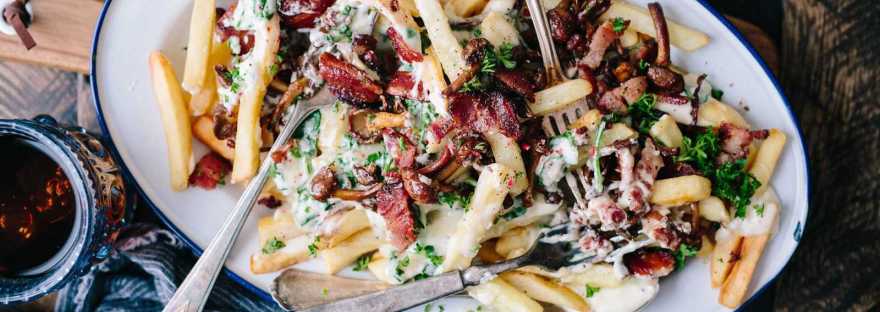 صحيح، ما الذي يمكن أن يكون أفضل من طبق بطاطس مقلية مطهو بالبخار مع المرق وجبنة حلوم؟ البطاطس المقلية، والمرق، وجبنة حلوم واللحم المقدد، هذا كل شيء! أضف بعضًا من الكراث الطازج والفلفل الحار وقليلاً من نخاع العظم المحمَّص ومرقة البط، وسنحول هذا الطبق الفرنسي الكندي المشهور إلى وجبة راقية.